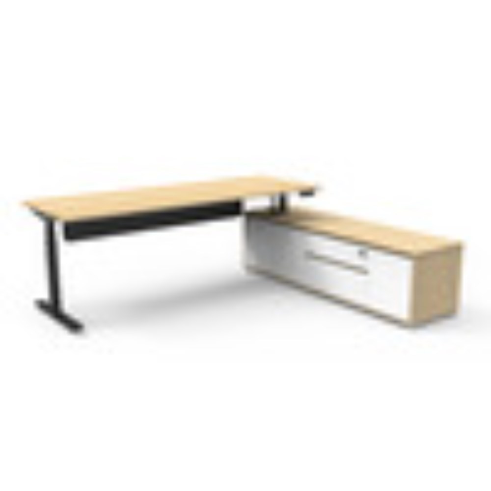 • Natural Oak top and Black Satin frame. Height adjustable desk with modesty panel and right hand side cabinet.