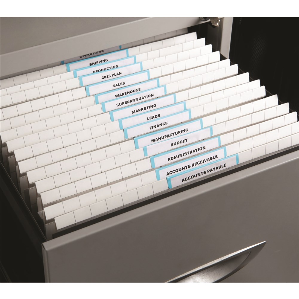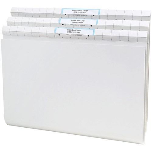 Suitable for upright filing in file cabinets, file cabinet drawers and shelving.