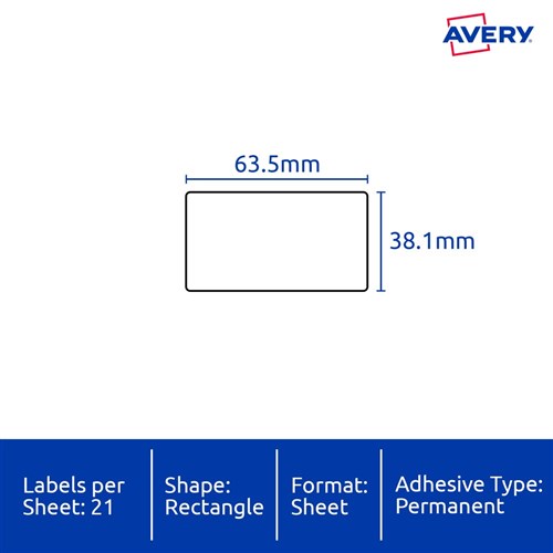 Size: 63.5x38.1mm 525 labels, 25 sheets. 21 labels per sheet (21UP).