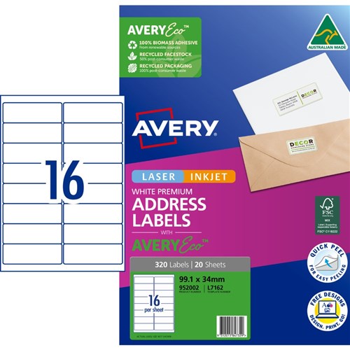 Avery Premium Address Labels White Laser Inkjet AveryEco L7162 99.1 x 34mm 16UP 320 Lab