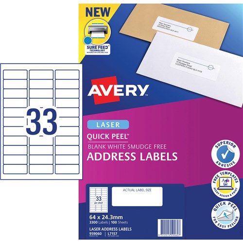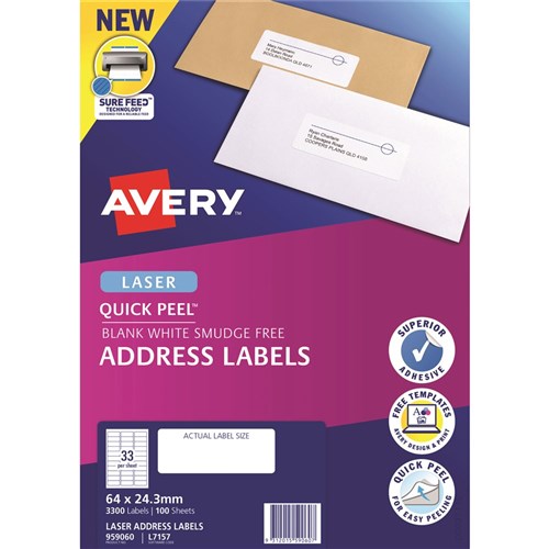 Avery Quick Peel Address Laser White L7157 64x24.3mm 33UP 3300 Labels 100 Sheets