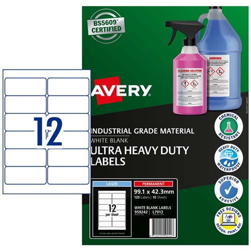 Avery Ultra-Resistant Chemical Grade Laser Labels L7913 99.1x 42.3mm White Pack of 10 (120)