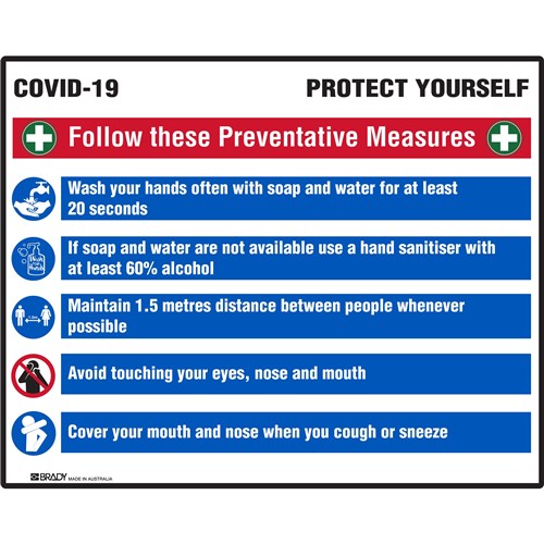 Brady Safety Sign Covid-19 Prevention Multi-Message 1500W x 1200mmH Corflute White/Blue