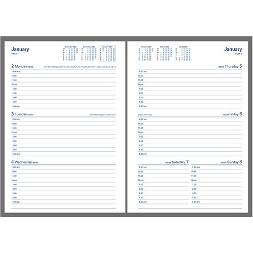 Lay flat opening, ribbon marker, week to view layout.
