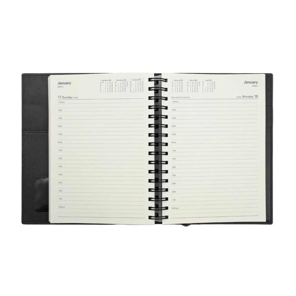 Ideal for those 'on the move' with its double wiro binding and heavily grained metallic and matt PU cover.