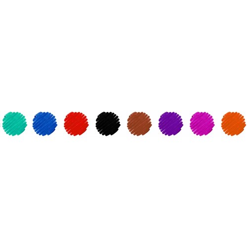 8 bright, vibrant colours in Red, Pink, Orange, Green, Blue, Violet, Brown and Black