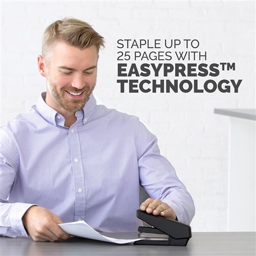 Full-strip EasyPress™ stapler effortlessly staples up to 25 sheets.