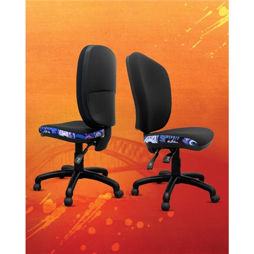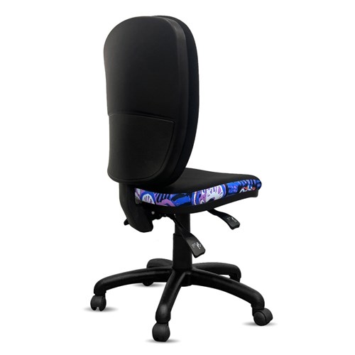 A unique commercial fabrics designed by Murdie Nampijinpa Morris (Indigenous Artist) combined with K2 Black Fabric to upholster the chair.
