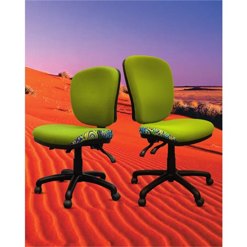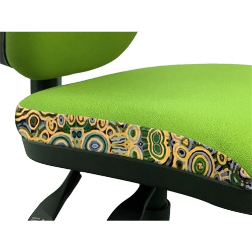 A unique commercial fabrics designed by Cedric Varcoe (Indigenous artist) combined with K2 Eucalyptus Green Fabric to upholster the chair.