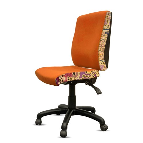 A unique commercial fabrics designed by Paddy Stewart (Indigenous artist) combined with K2 Golden Orange Fabric to upholster the chair.