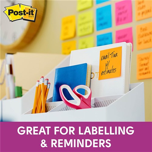 • Super Sticky Post-it® adhesive ensures that notes stick practically anywhere such as computer monitors, filing cabinets & furniture and remain as easily removable as original Post-it® Notes.