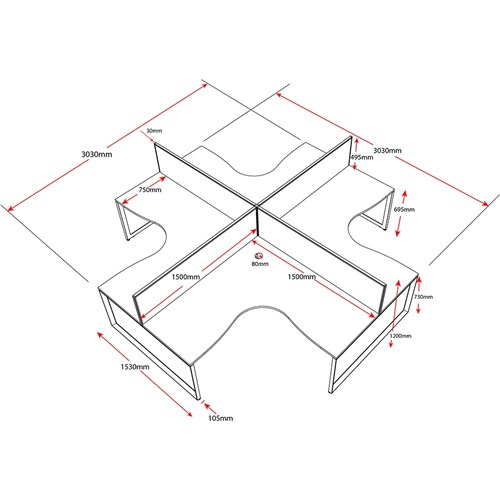 Overall Including Screen: 3030mm W x 3030mmW x 780mm D x 1200mm H. Per User: 1500mm W x 1500mmW x 750mm D. Desk Height: 730mm.