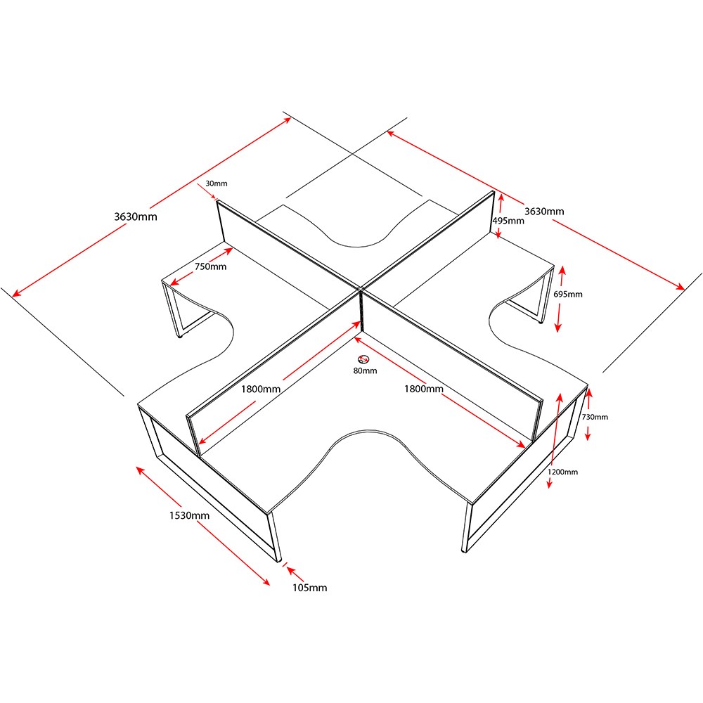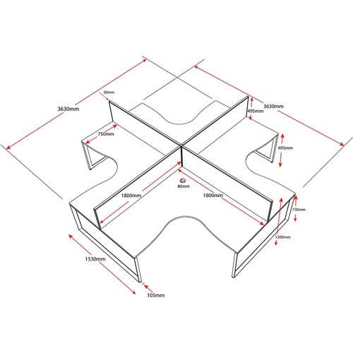 Overall Including Screen: 3630mm W x 3630mmW x 780mm D x 1200mm H. Per User: 1800mm W x 1800mmW x 750mm D. Desk Height: 730mm.