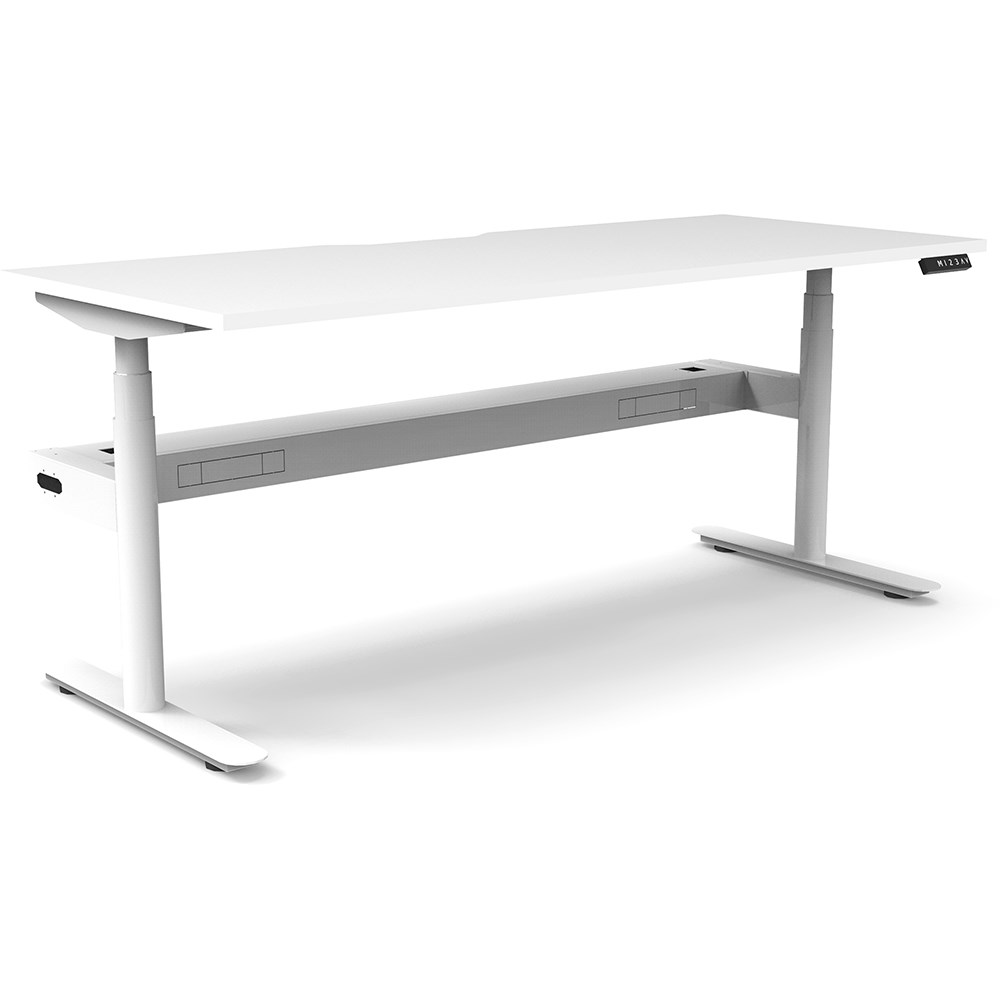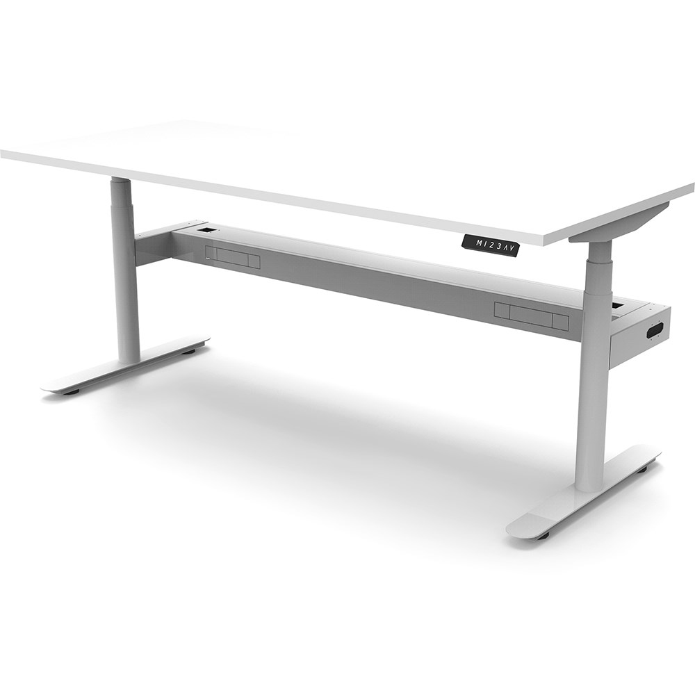70mm diameter round column legs. 700mm wide foot size with adjustable leveling feet, return foot: 700mm. Comes with cable tray for cable management.