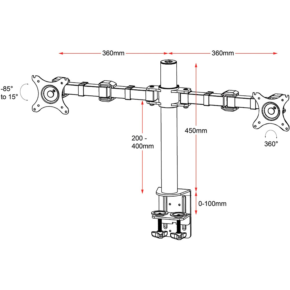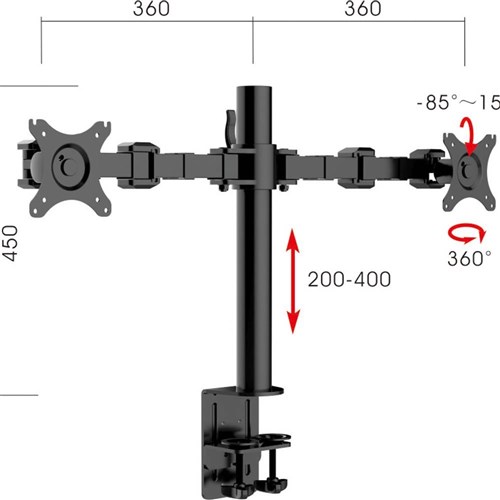 450mm centre pole height, 360mm arm reach each side.