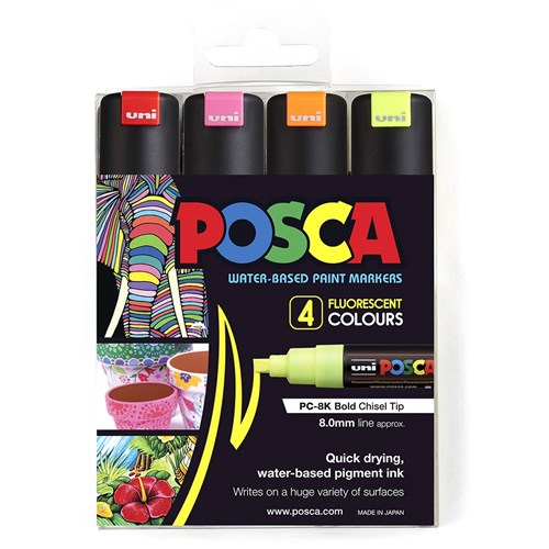 Uni Posca Paint Marker PC-8K Broad 8mm Chisel Tip Fluorescent Assorted Set of 4
